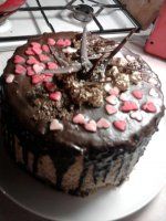 Rozpuštěnou čokoládu, spolu s máslem a smetanou nalijeme na vrch dortu a necháme stéct po stěnách. Nasypeme srdíčka, popřípadě dozdobíme dle fantazie.